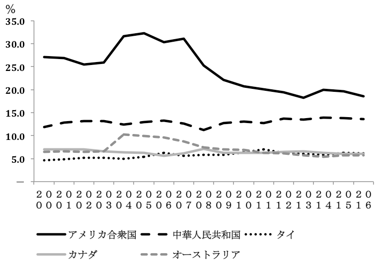 出所: 農林水産省ウェブサイト(http://www.maff.go.jp/)よりまず図1は、農林水産省の統計から、日本の農水産物輸入先の構成比の動向を示したものである。中国からの農水産物の輸入は、2000年以降ずっとアメリカ合衆国に次ぐ第2位であり、その比率は2008年こそ、毒入り餃子事件の影響か、やや落ち込みを見せたもののすぐに回復し、その後は一貫して全輸入の13〜14%で推移している。
